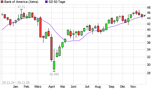 Mit dem Anstieg auf 44,65 EUR hat die Bank of America-Aktie am 24.11.2025 die 50-Tage-Linie nach oben gekreuzt.Die Bank of America-Aktie befindet sich seit dem 19.08.2025 im langfristigen Aufwärtstrend ...weiterlesen