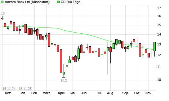 Mit dem Anstieg auf 13,30 EUR hat die Aozora Bank-Aktie am 14.11.2025 die 200-Tage-Linie nach oben gekreuzt.Die Aozora Bank-Aktie befand sich seit dem 05.11.2025 im langfristigen Abwärtstrend ...weiterlesen
