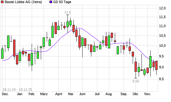 Mit dem Anstieg auf 9,14 EUR hat die Bastei Lübbe-Aktie am 17.11.2025 die 50-Tage-Linie nach oben gekreuzt.Die Bastei Lübbe-Aktie befindet sich seit dem 18.09.2025 im langfristigen Abwärtstrend ...weiterlesen