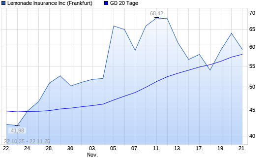 Mit dem Rücksetzer auf 58,94 EUR hat die Lemonade-Aktie am 21.11.2025 die 20-Tage-Linie nach unten gekreuzt.Die Lemonade-Aktie befindet sich seit dem 05.08.2025 im langfristigen Aufwärtstrend ...weiterlesen