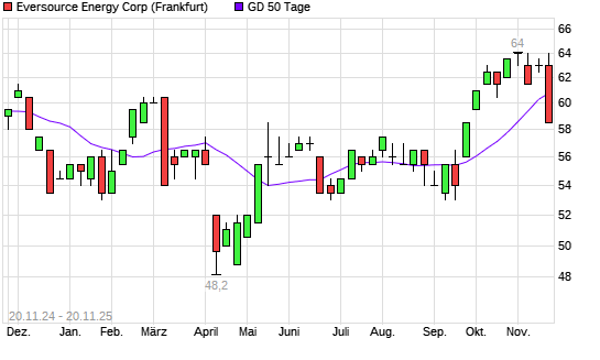 Mit dem Rücksetzer auf 58,50 EUR hat die Eversource Energy-Aktie am 19.11.2025 die 50-Tage-Linie nach unten gekreuzt.Die Eversource Energy-Aktie befindet sich seit dem 22.09.2025 im langfristigen ...weiterlesen