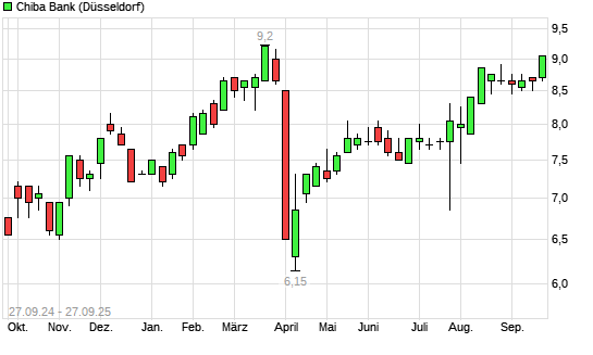 Mit dem Anstieg auf 9,10 EUR hat die Chiba Bank-Aktie (ISIN JP3511800009) am 26.09.2025 ein neues 6-Monats-Hoch erreicht und damit den Kurs vom 27.03.2025 eingestellt.Die Chiba Bank-Aktie befindet ...weiterlesen