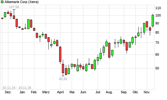 Mit dem Anstieg auf 99,82 EUR hat die Albemarle-Aktie (ISIN US0126531013) am 14.11.2025 ein neues 6-Monats-Hoch erreicht und damit den Kurs vom 13.11.2025 eingestellt.Die Albemarle-Aktie befindet ...weiterlesen
