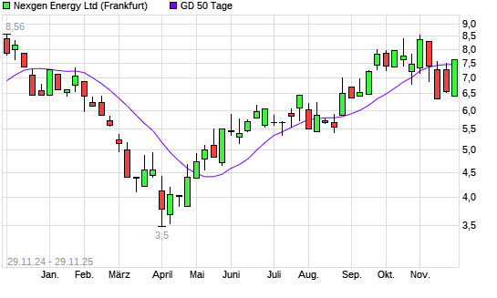 Mit dem Anstieg auf 7,62 EUR hat die Nexgen Energy-Aktie am 28.11.2025 die 50-Tage-Linie nach oben gekreuzt.Die Nexgen Energy-Aktie befindet sich seit dem 25.08.2025 im langfristigen Aufwärtstrend ...weiterlesen