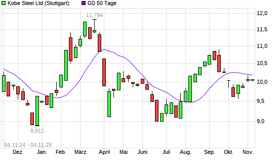 Mit dem Anstieg auf 10,21 EUR hat die Kobe Steel-Aktie am 03.11.2025 die 50-Tage-Linie nach oben gekreuzt.Die Kobe Steel-Aktie befindet sich seit dem 30.10.2025 im langfristigen Aufwärtstrend ...weiterlesen