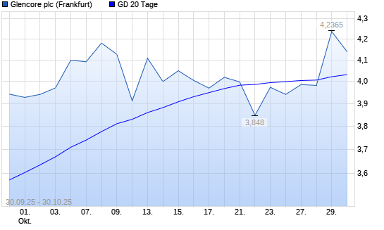 Mit dem Anstieg auf 4,24 EUR hat die Glencore-Aktie am 29.10.2025 die 20-Tage-Linie nach oben gekreuzt.Die Glencore-Aktie befindet sich seit dem 22.09.2025 im langfristigen Aufwärtstrend und ...weiterlesen