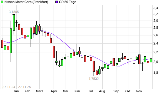Mit dem Anstieg auf 2,07 EUR hat die Nissan Motor-Aktie am 26.11.2025 die 50-Tage-Linie nach oben gekreuzt.Die Nissan Motor-Aktie befindet sich seit dem 08.10.2025 im langfristigen Abwärtstrend ...weiterlesen