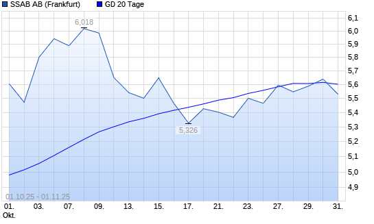 Mit dem Rücksetzer auf 5,53 EUR hat die SSAB-Aktie am 31.10.2025 die 20-Tage-Linie nach unten gekreuzt.Die SSAB-Aktie befindet sich seit dem 01.10.2025 im langfristigen Aufwärtstrend und ...weiterlesen