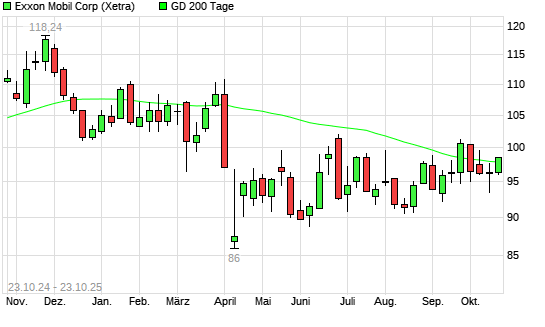 Mit dem Anstieg auf 98,36 EUR hat die Exxon Mobil-Aktie am 22.10.2025 die 200-Tage-Linie nach oben gekreuzt.Die Exxon Mobil-Aktie befand sich seit dem 10.10.2025 im langfristigen Abwärtstrend ...weiterlesen