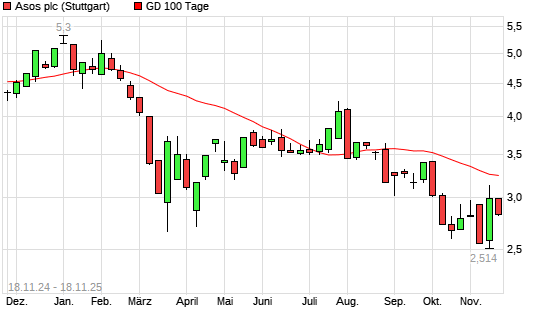 Mit dem Rücksetzer auf 2,86 EUR hat die ASOS-Aktie am 17.11.2025 die 100-Tage-Linie nach unten gekreuzt.Die ASOS-Aktie befindet sich seit dem 28.07.2025 im langfristigen Abwärtstrend und ...weiterlesen