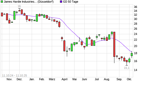 Mit dem Anstieg auf 18,40 EUR hat die James Hardie Industries-Aktie am 10.10.2025 die 50-Tage-Linie nach oben gekreuzt.Die James Hardie Industries-Aktie befindet sich seit dem 13.02.2025 im ...weiterlesen