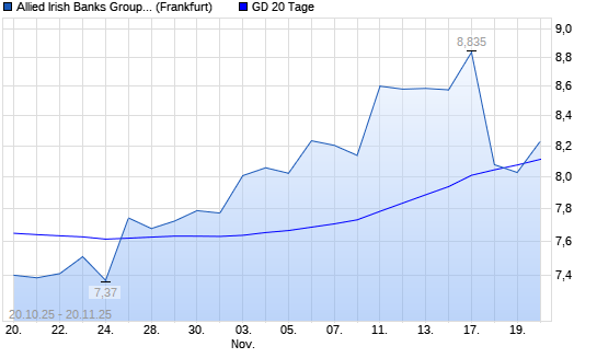 Mit dem Rücksetzer auf 8,03 EUR hat AIB Group am 19.11.2025 die 20-Tage-Linie nach unten gekreuzt. AIB Group befindet sich seit dem 23.04.2025 im langfristigen Aufwärtstrend und hat in diesem ...weiterlesen