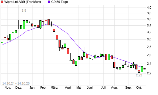 Mit dem Rücksetzer auf 2,30 EUR hat die Wipro ADR-Aktie am 13.10.2025 die 50-Tage-Linie nach unten gekreuzt.Der Abstand zur 200-Tage-Linie beträgt aktuell -14,61%. ...weiterlesen