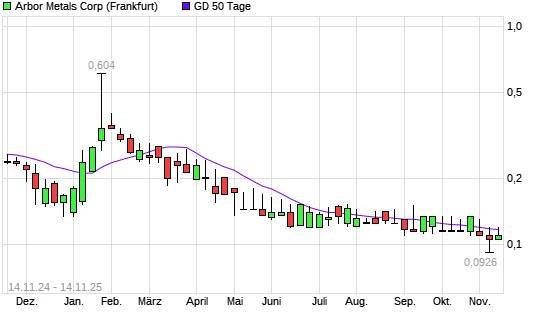 Mit dem Rücksetzer auf 0,11 EUR hat die Arbor Metals-Aktie am 13.11.2025 die 50-Tage-Linie nach unten gekreuzt.Die Arbor Metals-Aktie befindet sich seit dem 26.03.2025 im langfristigen ...weiterlesen