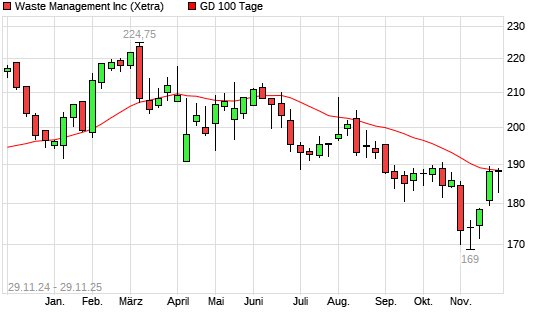 Mit dem Rücksetzer auf 188,18 EUR hat die Waste Management-Aktie am 28.11.2025 die 100-Tage-Linie nach unten gekreuzt.Die Waste Management-Aktie befindet sich seit dem 17.06.2025 im langfristigen ...weiterlesen