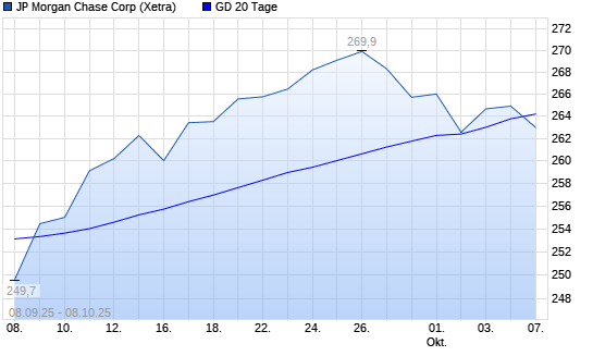 Mit dem Rücksetzer auf 263,90 EUR hat die JP Morgan Chase-Aktie am 07.10.2025 die 20-Tage-Linie nach unten gekreuzt.Die JP Morgan Chase-Aktie befindet sich seit dem 02.05.2025 im langfristigen ...weiterlesen