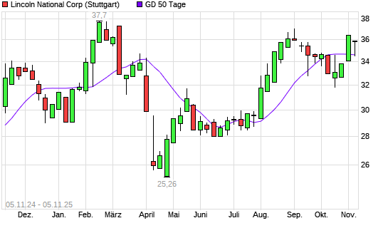 Mit dem Rücksetzer auf 34,67 EUR hat die Lincoln National-Aktie am 04.11.2025 die 50-Tage-Linie nach unten gekreuzt.Die Lincoln National-Aktie befindet sich seit dem 31.07.2025 im langfristigen ...weiterlesen
