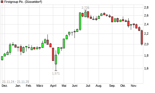 Mit dem Rücksetzer auf 2,03 EUR hat die Firstgroup-Aktie (ISIN GB0003452173) am 20.11.2025 ein neues 6-Monats-Tief erreicht und damit den Kurs vom 19.11.2025 eingestellt.Die Firstgroup-Aktie ...weiterlesen