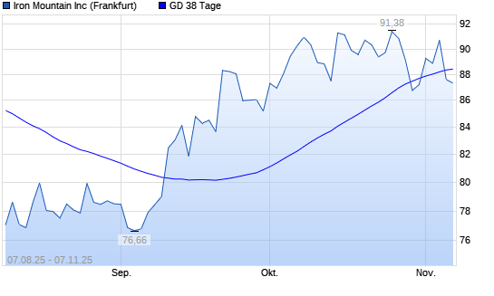 Mit dem Rücksetzer auf 87,60 EUR hat die Iron Mountain-Aktie am 06.11.2025 die 38-Tage-Linie nach unten gekreuzt.Die Iron Mountain-Aktie befindet sich seit dem 01.10.2025 im langfristigen ...weiterlesen