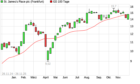 Mit dem Anstieg auf 14,76 EUR hat die St. James's Place-Aktie am 25.11.2025 die 100-Tage-Linie nach oben gekreuzt.Die St. James's Place-Aktie befindet sich seit dem 15.04.2025 im langfristigen ...weiterlesen
