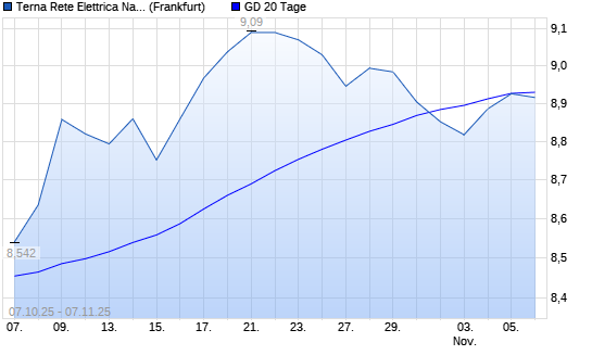 Mit dem Rücksetzer auf 8,92 EUR hat die Terna-Aktie am 06.11.2025 die 20-Tage-Linie nach unten gekreuzt.Die Terna-Aktie befindet sich seit dem 22.09.2025 im langfristigen Aufwärtstrend ...weiterlesen