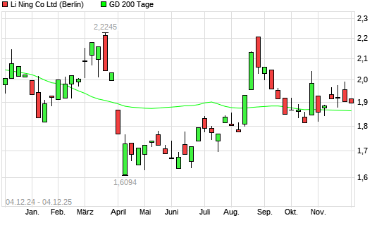 Mit dem Rücksetzer auf 1,85 EUR hat die Li Ning Co-Aktie am 03.12.2025 die 200-Tage-Linie nach unten gekreuzt.Die Li Ning Co-Aktie befand sich seit dem 05.11.2025 im langfristigen Aufwärtstrend ...weiterlesen