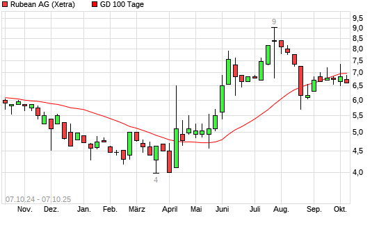 Mit dem Rücksetzer auf 6,50 EUR hat die Rubean-Aktie am 06.10.2025 die 100-Tage-Linie nach unten gekreuzt.Die Rubean-Aktie befindet sich seit dem 30.05.2025 im langfristigen Aufwärtstrend ...weiterlesen
