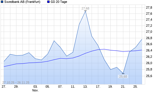 Mit dem Anstieg auf 26,50 EUR hat die Swedbank AB-Aktie am 25.11.2025 die 20-Tage-Linie nach oben gekreuzt.Die Swedbank AB-Aktie befindet sich seit dem 17.04.2025 im langfristigen Aufwärtstrend ...weiterlesen
