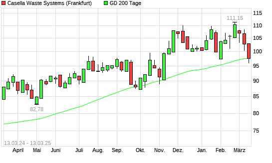 Mit dem Rücksetzer auf 96,38 EUR hat die Casella Waste Systems-Aktie am 12.03.2025 die 200-Tage-Linie nach unten gekreuzt.Die Casella Waste Systems-Aktie befand sich seit dem 11.03.2025 ...weiterlesen