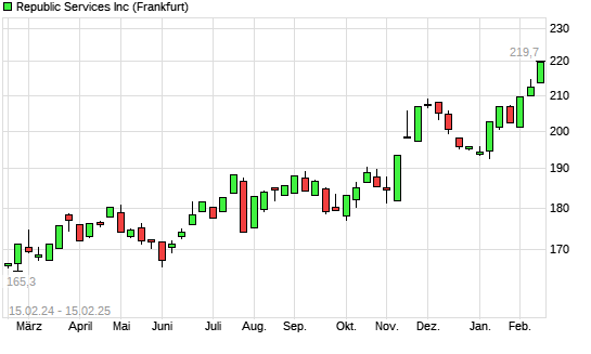 Mit dem Anstieg auf 219,70 EUR hat die Republic Services-Aktie (ISIN US7607591002) am 14.02.2025 ein neues All-Time-High erreicht und damit den Kurs vom 13.02.2025 eingestellt.Die Republic Services-Aktie ...weiterlesen