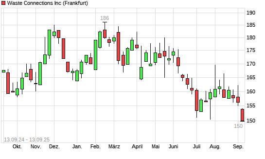 Mit dem Rücksetzer auf 150,00 EUR hat die Waste Connections-Aktie (ISIN CA94106B1013) am 12.09.2025 ein neues 12-Monats-Tief erreicht und damit den Kurs vom 10.09.2025 eingestellt.Die Waste ...weiterlesen