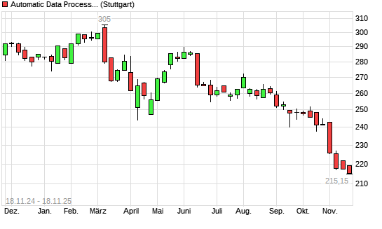 Mit dem Rücksetzer auf 218,00 EUR hat die Automatic Data Processing-Aktie (ISIN US0530151036) am 17.11.2025 ein neues 12-Monats-Tief erreicht und damit den Kurs vom 13.11.2025 eingestellt.Die ...weiterlesen