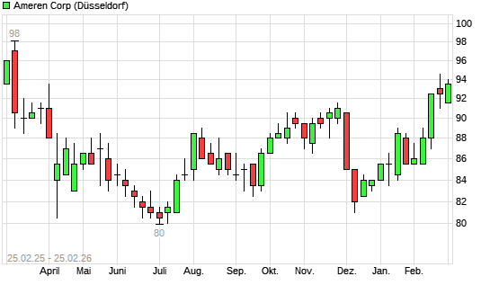 Mit dem Anstieg auf 94,00 EUR hat die Ameren-Aktie (ISIN US0236081024) am 24.02.2026 ein neues 6-Monats-Hoch erreicht und damit den Kurs vom 12.02.2026 eingestellt.Die ...weiterlesen