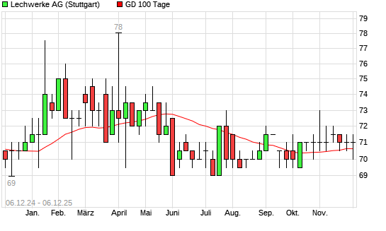 Mit dem Anstieg auf 71,00 EUR hat die Lechwerke-Aktie am 05.12.2025 die 100-Tage-Linie nach oben gekreuzt.Die Lechwerke-Aktie befindet sich seit dem 19.11.2025 im langfristigen Abwärtstrend ...weiterlesen