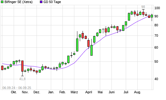 Mit dem Anstieg auf 92,60 EUR hat die Bilfinger-Aktie am 05.09.2025 die 50-Tage-Linie nach oben gekreuzt.Die Bilfinger-Aktie befindet sich seit dem 22.01.2025 im langfristigen Aufwärtstrend ...weiterlesen