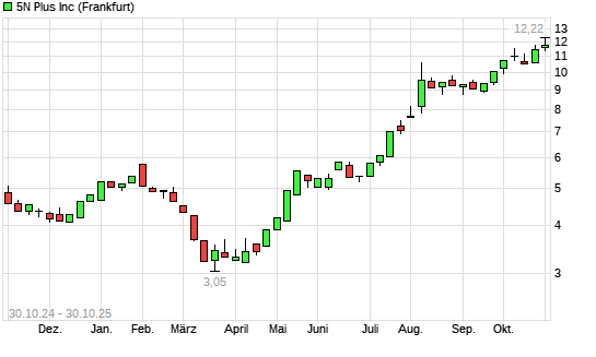 Mit dem Anstieg auf 12,40 EUR hat die 5N Plus-Aktie (ISIN CA33833X1015) am 29.10.2025 ein neues All-Time-High erreicht und damit den Kurs vom 23.10.2025 eingestellt.Der Abstand zur 200-Tage-Linie ...weiterlesen