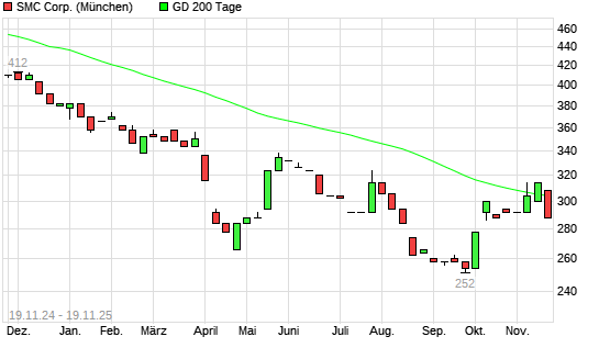 Mit dem Rücksetzer auf 290,00 EUR hat die SMC-Aktie am 18.11.2025 die 200-Tage-Linie nach unten gekreuzt.Die SMC-Aktie befand sich seit dem 13.11.2025 im langfristigen Aufwärtstrend und ...weiterlesen