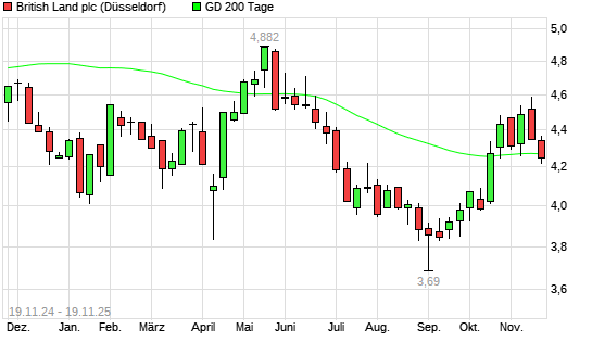 Mit dem Rücksetzer auf 4,26 EUR hat die British Land-Aktie am 18.11.2025 die 200-Tage-Linie nach unten gekreuzt.Die British Land-Aktie befand sich seit dem 05.11.2025 im langfristigen Aufwärtstrend ...weiterlesen