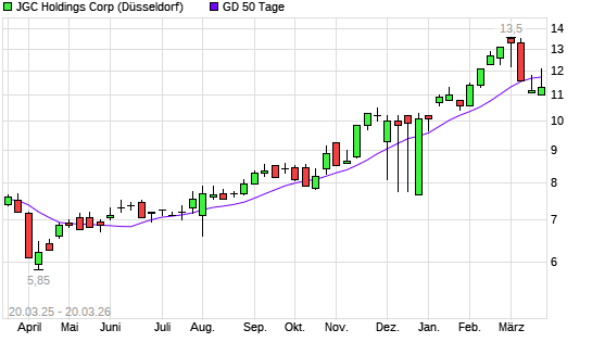 Mit dem Rücksetzer auf 11,60 EUR hat die JGC-Aktie am 19.03.2026 die 50-Tage-Linie nach unten gekreuzt.Die JGC-Aktie befindet sich seit dem 23.07.2025 im langfristigen ...weiterlesen