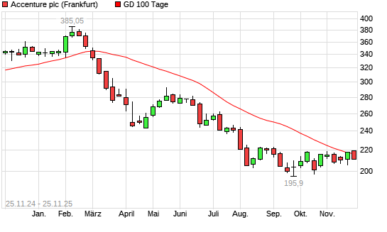 Mit dem Rücksetzer auf 215,25 EUR hat die Accenture-Aktie am 24.11.2025 die 100-Tage-Linie nach unten gekreuzt.Die Accenture-Aktie befindet sich seit dem 05.03.2025 im langfristigen Abwärtstrend ...weiterlesen