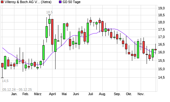 Mit dem Rücksetzer auf 15,95 EUR hat die Villeroy & Boch Vz-Aktie am 04.12.2025 die 50-Tage-Linie nach unten gekreuzt.Die Villeroy & Boch Vz-Aktie befindet sich seit dem 28.10.2025 ...weiterlesen