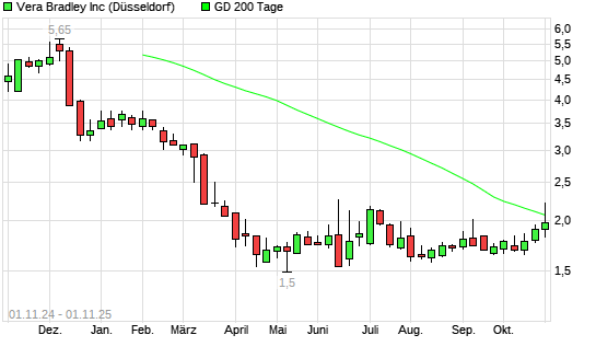 Mit dem Rücksetzer auf 1,94 EUR hat die VERA BRADLEY-Aktie am 31.10.2025 die 200-Tage-Linie nach unten gekreuzt.Die VERA BRADLEY-Aktie befand sich seit dem 29.10.2025 im langfristigen Aufwärtstrend ...weiterlesen