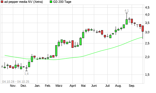 Mit dem Rücksetzer auf 2,70 EUR hat die Ad Pepper Media-Aktie am 03.10.2025 die 200-Tage-Linie nach unten gekreuzt.Die Ad Pepper Media-Aktie befand sich seit dem 07.02.2025 im langfristigen ...weiterlesen
