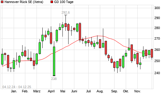 Mit dem Rücksetzer auf 250,80 EUR hat die Hannover Rück-Aktie am 03.12.2025 die 100-Tage-Linie nach unten gekreuzt.Die Hannover Rück-Aktie befindet sich seit dem 10.10.2025 im langfristigen ...weiterlesen