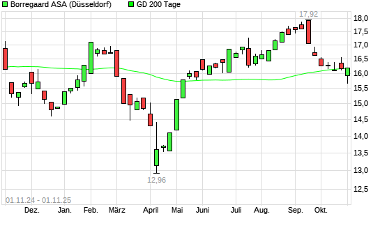 Mit dem Anstieg auf 16,40 EUR hat die Borregaard-Aktie am 31.10.2025 die 200-Tage-Linie nach oben gekreuzt.Die Borregaard-Aktie befand sich seit dem 24.10.2025 im langfristigen Abwärtstrend ...weiterlesen