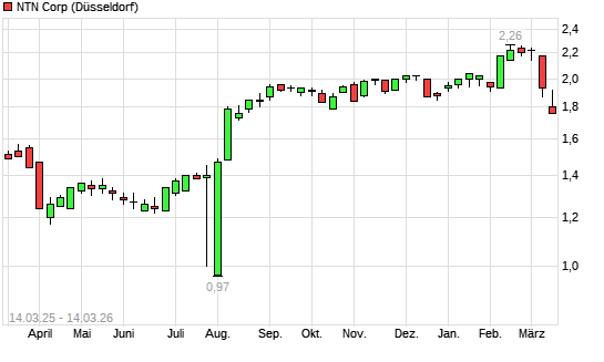 Mit dem Rücksetzer auf 1,78 EUR hat die NTN Corporation-Aktie (ISIN JP3165600002) am 13.03.2026 ein neues 6-Monats-Tief erreicht und damit den Kurs vom 13.10.2025 eingestellt.Die ...weiterlesen