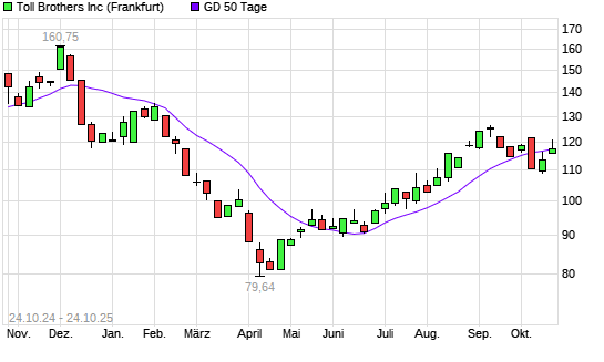 Mit dem Rücksetzer auf 116,80 EUR hat die Toll Brothers-Aktie am 23.10.2025 die 50-Tage-Linie nach unten gekreuzt.Die Toll Brothers-Aktie befindet sich seit dem 14.08.2025 im langfristigen ...weiterlesen