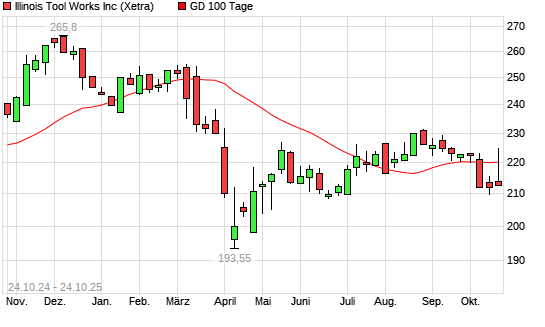 Mit dem Rücksetzer auf 219,60 EUR hat die Illinois Tool Works (ITW)-Aktie am 23.10.2025 die 100-Tage-Linie nach unten gekreuzt.Die Illinois Tool Works (ITW)-Aktie befindet sich seit dem ...weiterlesen