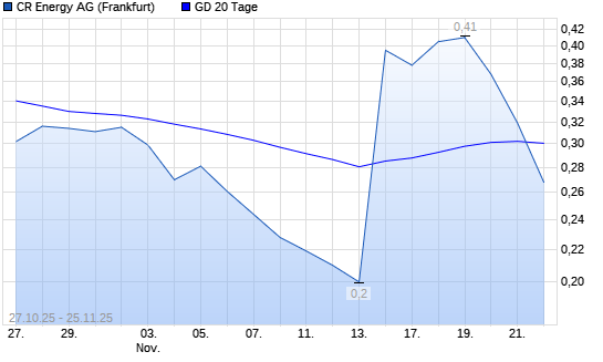 Mit dem Rücksetzer auf 0,27 EUR hat die CR Energy-Aktie am 24.11.2025 die 20-Tage-Linie nach unten gekreuzt.Die CR Energy-Aktie befindet sich seit dem 21.08.2024 im langfristigen Abwärtstrend ...weiterlesen