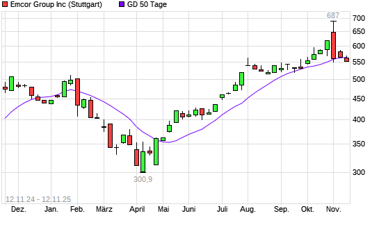 Mit dem Anstieg auf 569,80 EUR hat die EMCOR Group-Aktie am 11.11.2025 die 50-Tage-Linie nach oben gekreuzt.Die EMCOR Group-Aktie befindet sich seit dem 16.06.2025 im langfristigen Aufwärtstrend ...weiterlesen